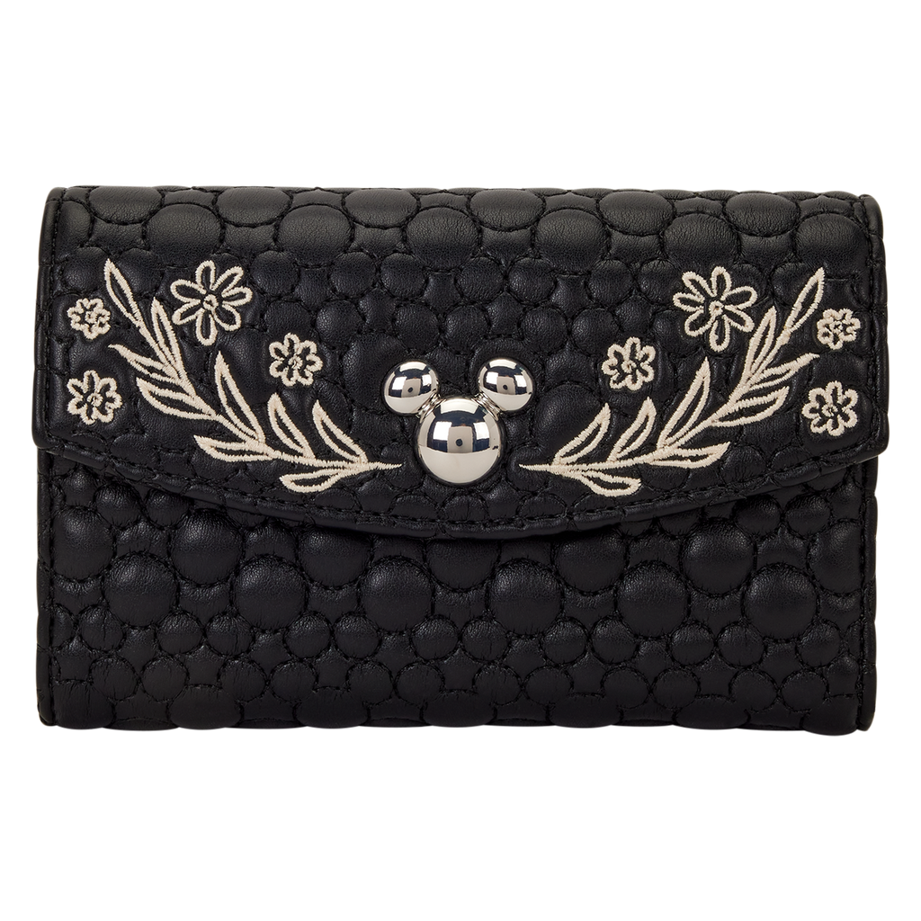This wallet features a quilted pattern all over of Mickey Mouse silhouettes. The top flap features a metal charm of a Mickey Mouse silhouette flanked by embroidered details of flowers and leaves. Inside, there are seven card slots and one clear slot for an ID. It's the perfect Disney accessory to accompany you throughout the day!