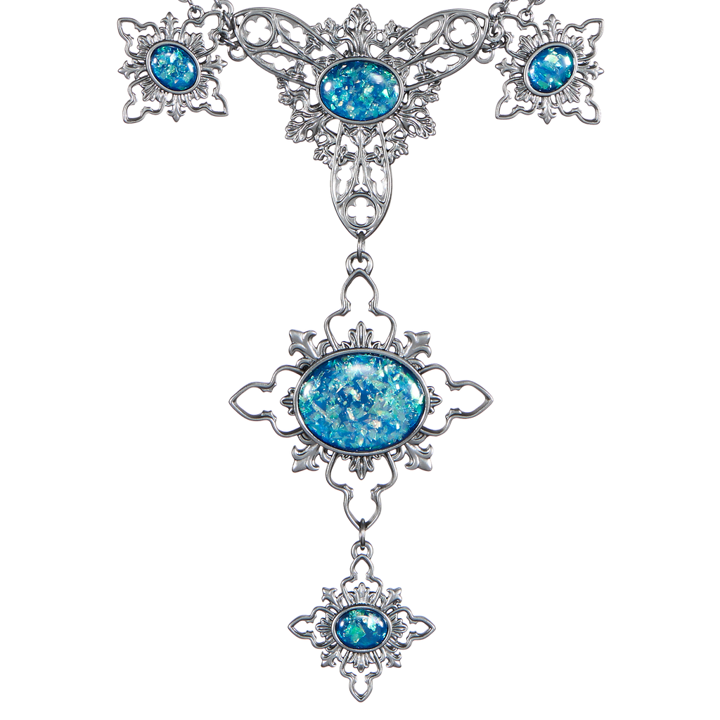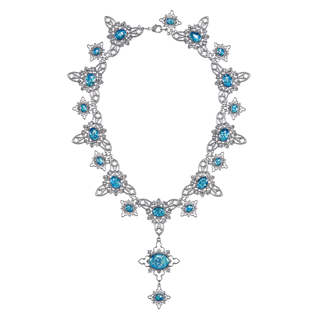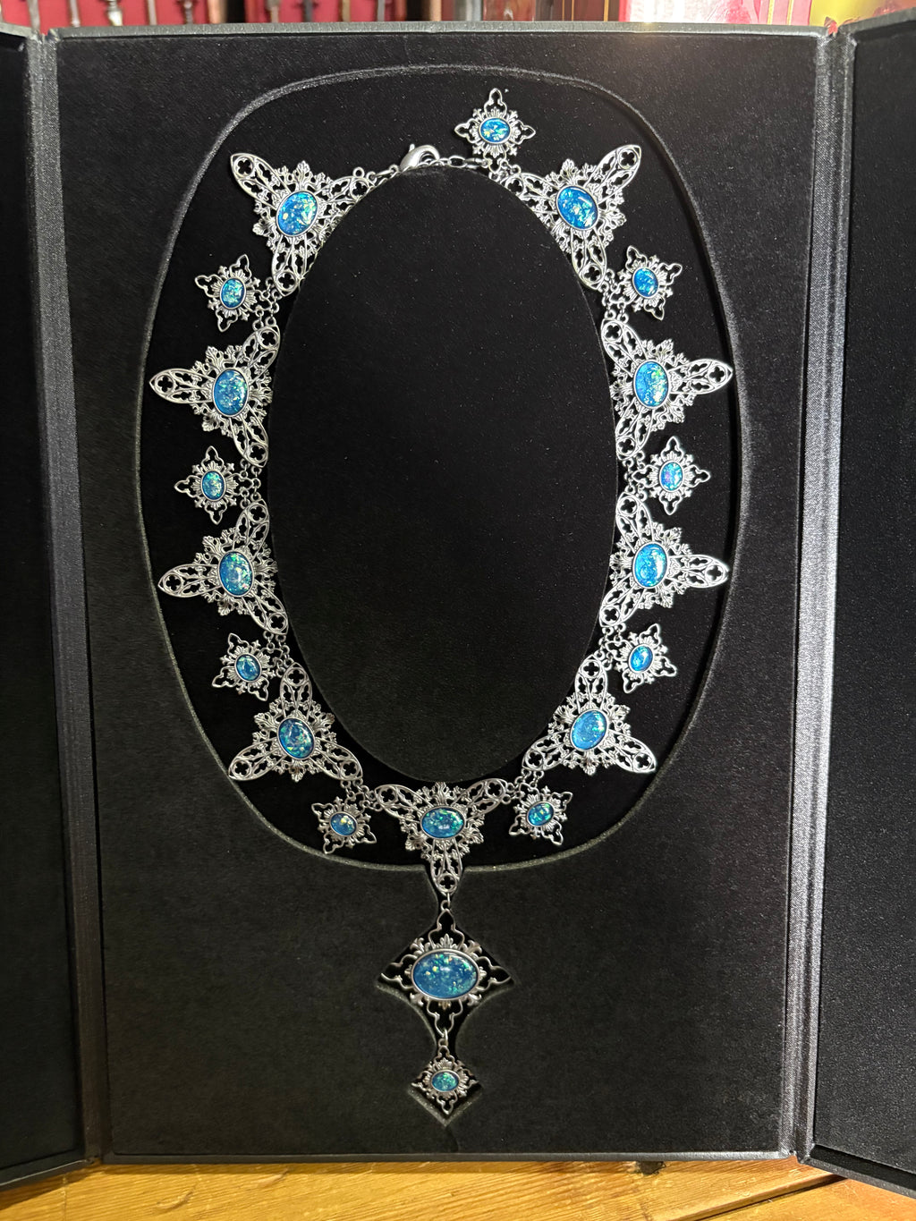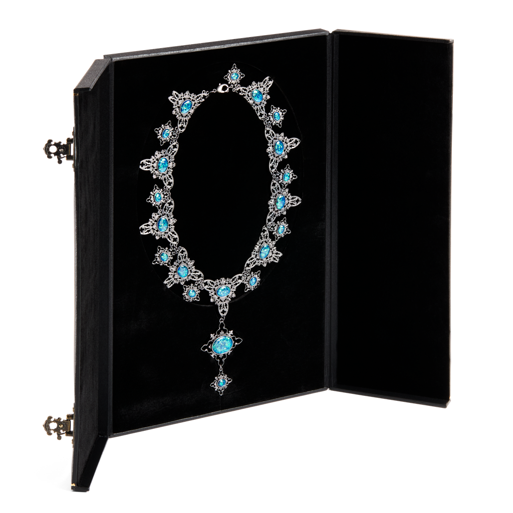 An intricate prop replica of the cursed opal necklace from Harry Potter and the Half-Blood Prince, complete with aged silver finish and 20 shimmering iridescent blue stones, in a leatherette collector’s box.